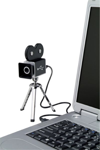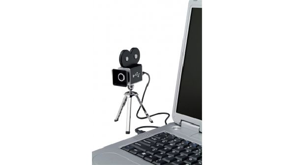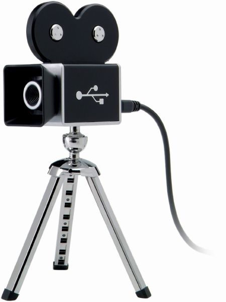 Movie Camera Web Cam. Retro movie camera webcam, 640 x 480 VGA (300K pixels), VGA 15 frames / second, 1.5 metre USB cable, USB 1.1 interface, focusing lens, capture button and detachable tripod with software included.