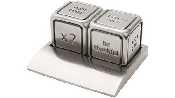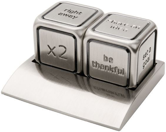 Decision Maker Action Dices. Dices can be rolled for 36 different leadership phrases. Includes matching metal alloy cradle. Metal.