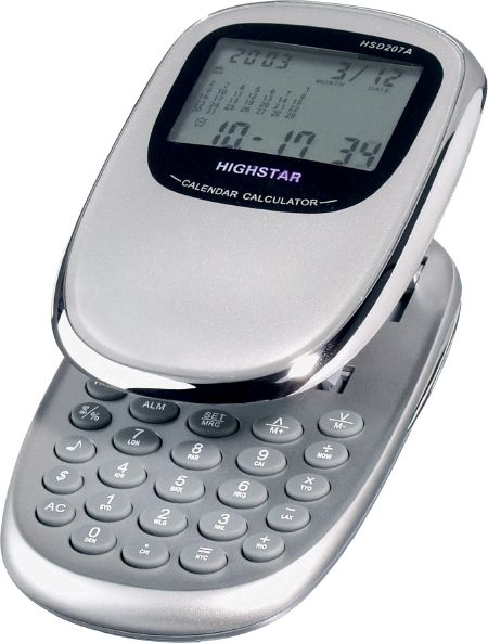 World Timer Calculator. 8 Digit calculator with sliding cover, world timer, 12 / 24 alarm clock, calander and currency converter.