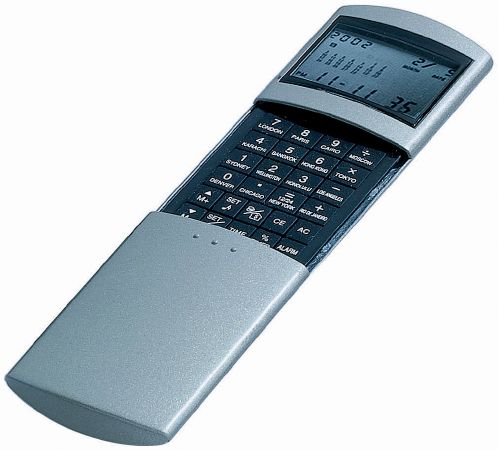 World Timer Calculator. 8 Digit calculator with sliding cover, calendar, alarm clock, world timer and 12/24 hour format. In PU pouch. Metal.