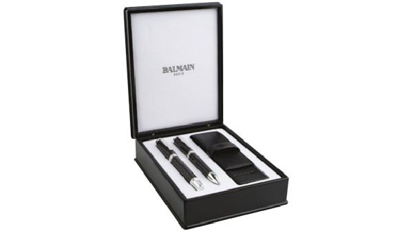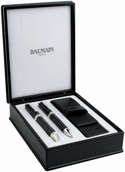 Balmain Millau Executive Gift Set. Ballpoint and roller ball with carbon fibre finishing and imitation leather pouch, packed in luxury wooden gift box with imitation leather cover and contrast stitching.