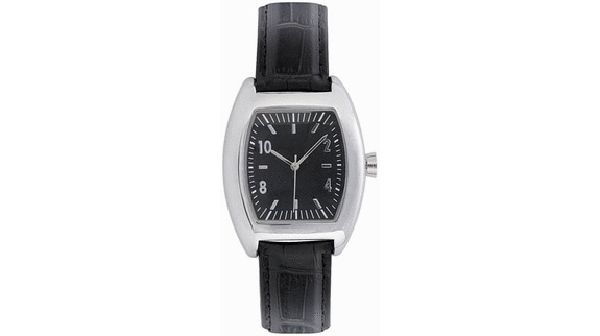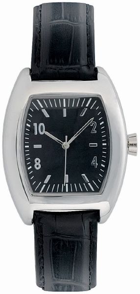Silhouette Gents. 3 Hand Japanese movement. case dimension : 39.36 x 38.50 mm. Printing area : 16 mm x 11 mm. Brass case in shiny chrome finish. 3 ATM water resistant. 20 mm black imitation croco leather strap. Supplied in a black suede pouch.