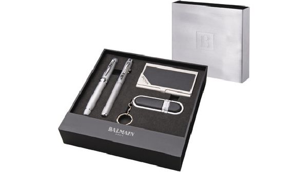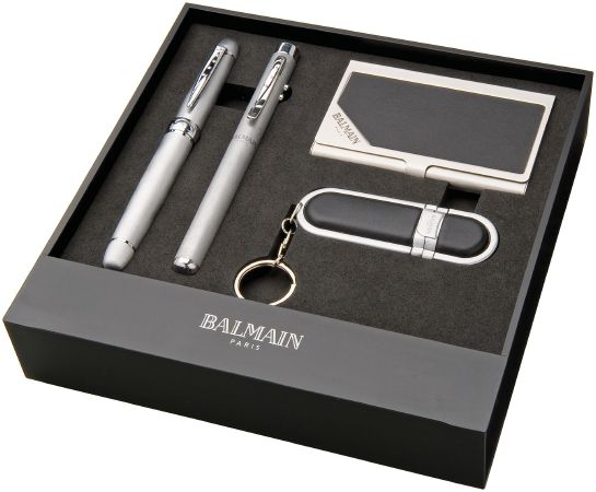 Balmain Corsica Gift Set. Designed luxury brushed aluminium packaging with Ballpoint / laser pointer / business card holder and USB stick all with the same brushed image.