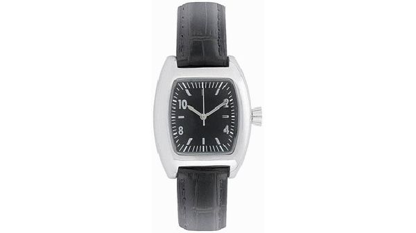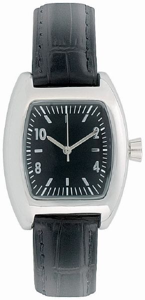 Silhouette Ladies. 3 Hand Japanese movement. Case dimension: 37.7 x 31 mm. Printing area: 12 x 9 mm. Brass case in shiny chrome finish. 3 ATM water resistant. 16 mm black imitation croco leather strap. Supplied in a black suede pouch.