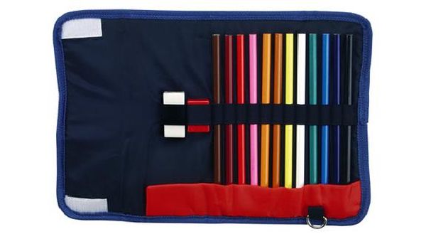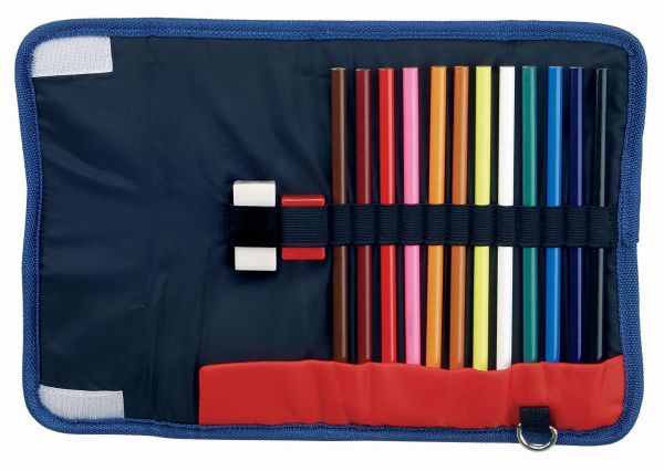 Children's Pencil Pouch. Includes 12 coloured pencils, eraser, sharpener and pouch with velcro closure. 600D.