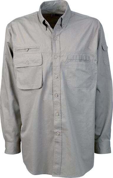 Outdoor Shirt. Button down collar. Several pockets on the front and sleeves. Elbow patches. Twill of 100% combed Cotton. 140 g/m²