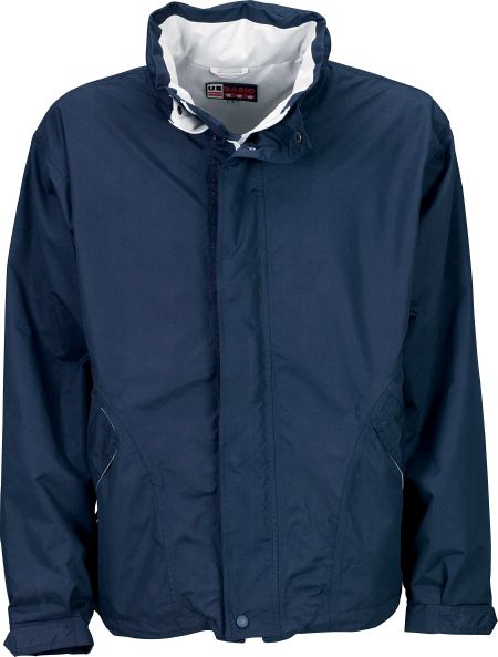 Sydney Jacket. Water resistant. Foldaway hood in collar. Front pockets with flap and cuffs with adjustable velcro closure. Wind placket and inside pockets with zipper in the lining for access to the print and embroidery areas. Fabric of 100% Polyester Dobby microfiber peached with PU coating. Lining of 100% Polyester mesh.