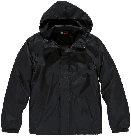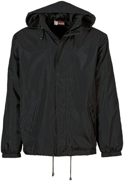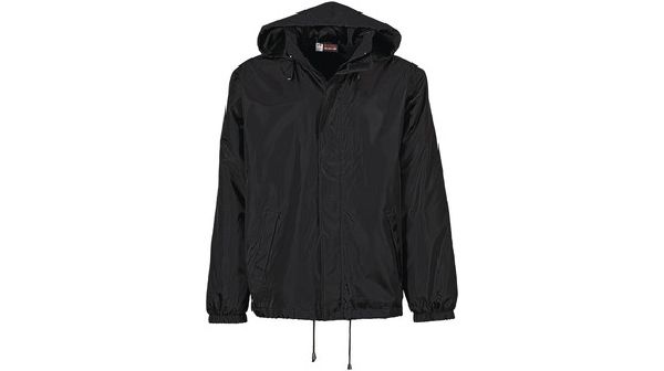 Cheviot Wind Breaker. Foldaway hood in collar. Front placket with velcro to cover the main zipper. Front pockets. Elastic cuffs. Drawstring on the bottom. Inside pocket with velcro closure. Hanging loop. Fabric of 100% Polyester Taffeta with PU transparent coating. Body lining of 100% Polyester anti pilling fleece . Sleeve lining of 100% Polyester Taffeta.