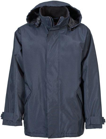 Cambridge Parka. Foldaway hood in collar. Front placket with velcro and hidden snap buttons. Front pockets with zipper. Cuffs with adjustable velcro closure. Inside pockets and mobile phone pocket, also with hanging loop. Fabric of 100% Polyester 300D with PVC coating. Lining of 100% Polyester 190T.