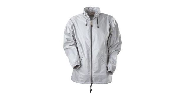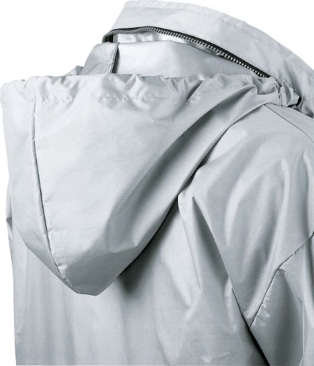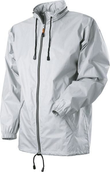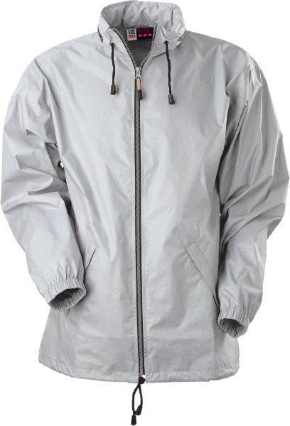 Toronto Windbreaker. Foldaway hood into collar and elastic cuffs. Drawstring with cord stoppers on the bottom and drawstring with cord stopper in collar. Eyelets under the sleeves. Finely woven fabric of 100% Nylon with silver coloured coating.