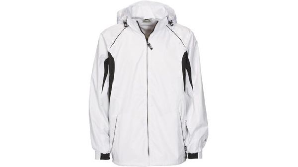 IPod Sports Jacket. Water resistant, detachable hood with reversed zippers and featuring front pockets with zippers. Drawcord with cord stoppers on the bottom. Compatible with both iPod and iPhone. Inner MP3 pocket with earpiece plug-in, and has control patch on the surface of the left hand sleeve. Jacket is machine washable when iPod/iPhone and connector are removed. Fabric of 100% Ribstop Polyester with milky coating. Lining of 100% Polyester mesh.
