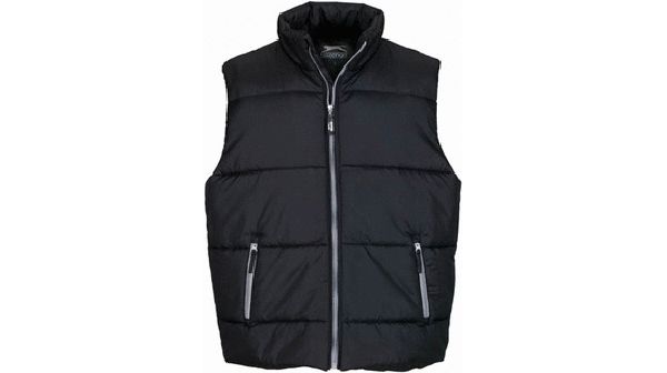 Action Body Warmer. Front pockets with zipper and chin cover. Slazenger print on the back with inside pocket. Fabric of 100% Polyester pongee with A/C milky coating. Lining of 100% Polyester Taffeta. Padding of 100% Polyester.