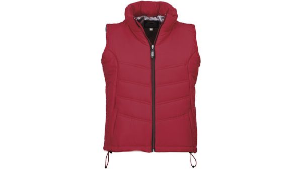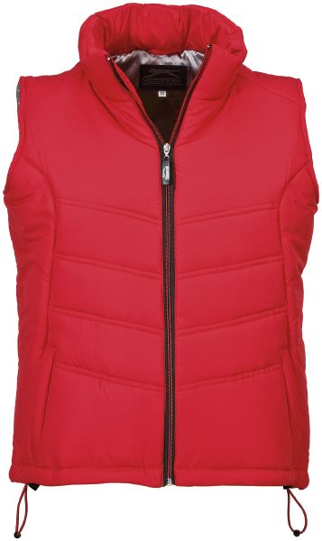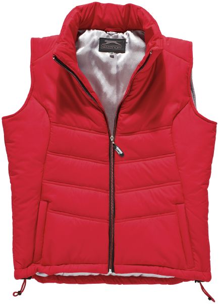 Ladies' Vigour Body Warmer. Front pockets with zipper. Drawstring with cord stoppers on the bottom. Inside pockets. Hanging loop. Fabric of 100% Polyester peach skin Pongee with transparent coating. Lining of 100% Polyester satin with Polyester padding.