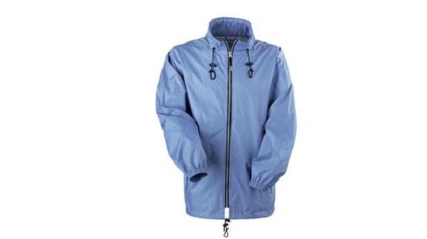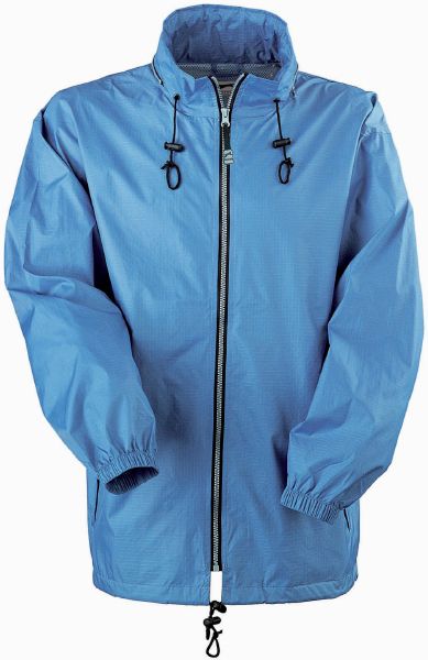Sport Jacket. Water resistant. Slazenger embroidery on back with two front pockets and foldaway hood in collar. Drawstring with cord stopper in collar and elastic cuffs. Drawstring with cord stoppers on the bottom of the jacket and hanging loop. Fabric of 100% rip stop Nylon with silver coating. Lining of 100% Polyester mesh.