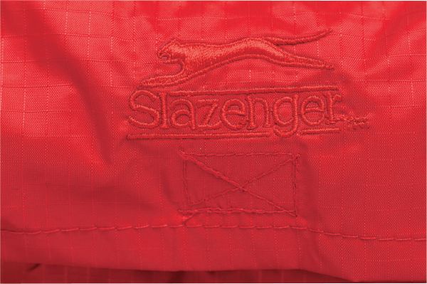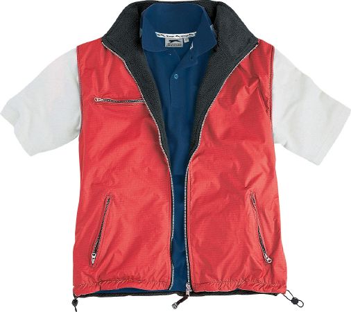Reversible Body Warmer. Outside: Slazenger embroidery on back collar and foldaway hood in collar. Front pockets with zipper and chest pocket with zipper. Drawstring with cord stoppers on the bottom. Inside: Front pockets with zipper and embroidery and print access through zipper in side seam. Outside fabric of 100% rip stop Nylon with silver coating. Inside fabric of 100% Polyester fleece.