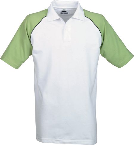 Raglan Polo. 1 x 1 Flat knit rib collar and contrast coloured piping on raglan sleeves. 2 Button placket with embossed tone in tone buttons and flag label with Slazenger embroidery on the back. Embroidered main label and neck tape. Piqué knit of 100% combed Cotton. 220 g/m²