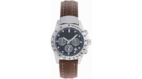 Timberwood. Japanese chrono movement (1/1 sec) Case dimension : 39.90 mm. Printing area : 22 mm x 10 mm. Brass case with 20 mm brown padded leather strap and white stitching. 3 ATM water resistant. Supplied in a black suede pouch.