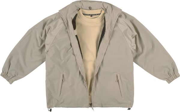 Corporate Jacket. Water resistant. Foldaway hood in collar and raglan sleeves. Cuffs with elastic and front pockets with zipper. Drawstring with cord stoppers on the bottom and hanging loop. Rubber main label and 3 inside pockets, 1 pocket with a zipper. Opening in the lining for access to the print and embroidery areas. Fabric of 100% Nylon tussor. Lining of 100% Polyester microfleece.