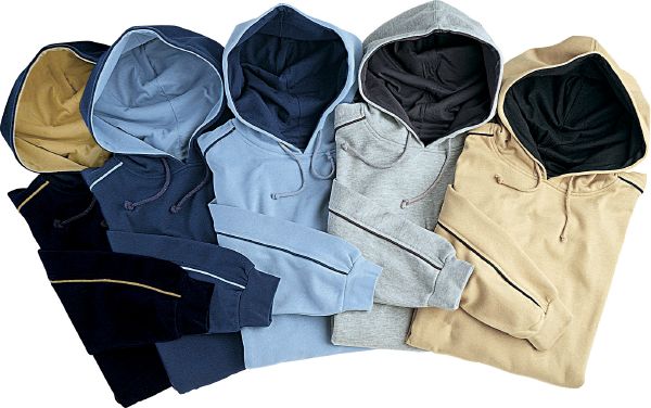 Hooded Sweater. 1 x 1 Rib knit cuffs and hem with Elasthane. Single jersey knit lining inside hood. Contrast coloured drawstring and contrast coloured piping on shoulder and sleeves with flag label. Rubber Slazenger label on the bottom and woven Slazenger neck tape. Brushed on the inside. Knit of 80% combed Cotton and 20% Polyester. 300 g/m²