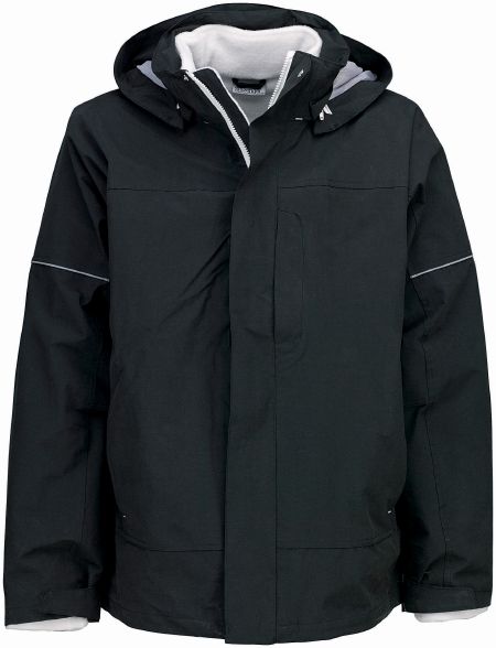 3 In 1 Jacket. Water resistant. Outer jacket: Detachable hood inside collar and chin cover. Front pockets with zipper and chest pocket with zipper. Reflective piping on sleeves and cuffs with elastic and adjustable velcro closure. Drawstring with cord stoppers on the bottom and 2 inside pockets. Hanging loop. Inside jacket: Decorative flatlock stitching with chest pocket and hanging loop. Fabric of 70% Cotton and 30% Nylon. Lining of 100% Polyester. Inner jacket of 100% Polyester fleece.