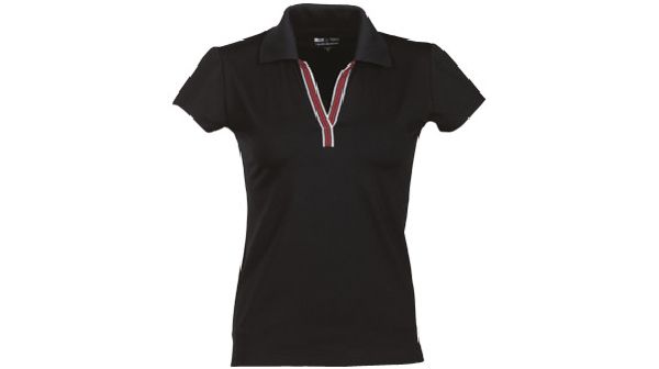 Ladies' Tactel® V-Neck Polo. 1 x 1 Rib knit collar, form-fitted and v-neck with 3 colour tape and side slits. Printed main label and neck tape. Single jersey knit of 90% Polyamide and 10% DuPont® Lycra. 220 g/m²