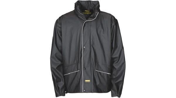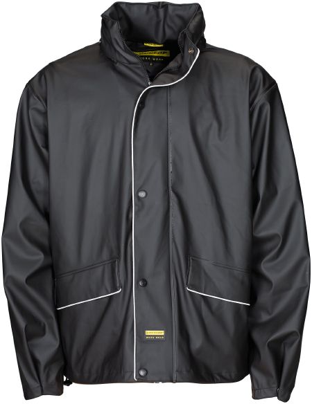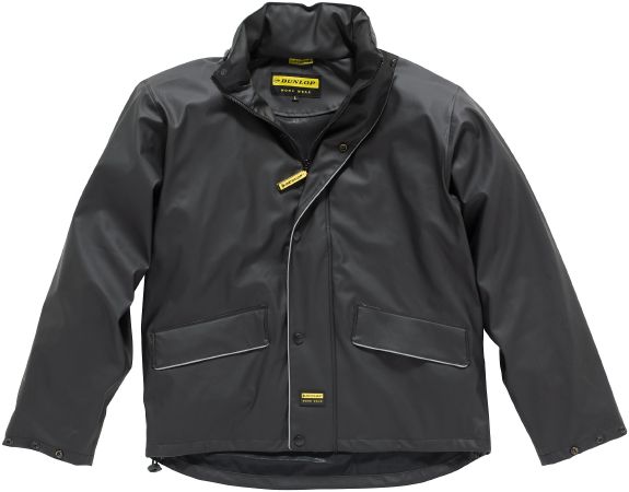 Nazko Rain Jacket. YKK front zipper. Foldaway hood with drawstring and cord stoppers inside collar. Storm flap with snap buttons and front pockets. Cuffs with snap buttons for adjustment and elastic cord with cord stoppers on the bottom. Extended back and rubber Dunlop label on the storm flap. Fabric of 30% PU and 70% PVC bonded with a knitted fabric of 100% Polyester. Wind and waterproof. Taped seams.