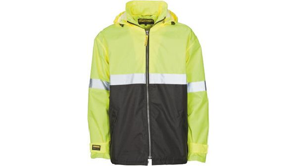 Sajama Jacket. Taped seams. YKK front zipper. Detachable hood with drawstring and cord stoppers, foldable into collar. Elastic cord with cord stoppers on the bottom. Front pockets and cuffs with adjustable velcro closure. Reflective safety stripe on the chest and sleeves. Several inner pockets with smaller pockets for tools and address label. Rubber Dunlop label on the end of the sleeve. Fabric of 100% Polyester Oxford with PU coating. Lining body of 100% Polyester mesh. Sleeve lining of 100% Polyester taffeta.