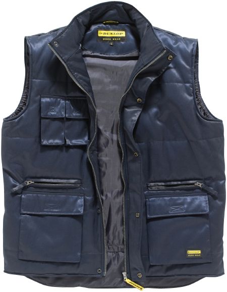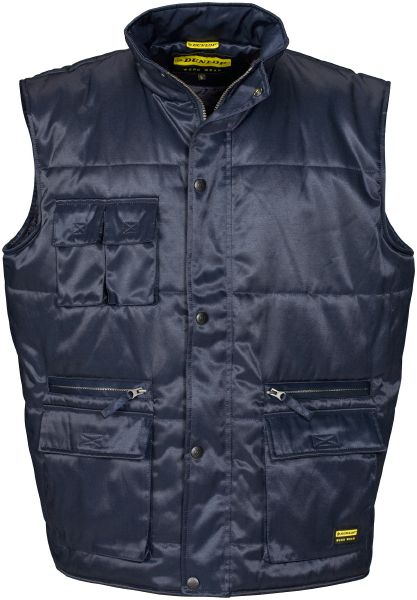 Maipo Body Warmer. YKK front zipper. Storm flap with snap buttons and double front pockets with velcro closure. Chest pockets with velcro closure and phone pockets on chest with velcro closure. Extra pockets on waist with zippers for extra storage. Several inner pockets with smaller tool pockets and address label. Extended back and rubber Dunlop label on the front pocket. Fabric of 50% Cotton and 50% Polyester. Lining of 100% Polyester. Padding of 100% Polyester.
