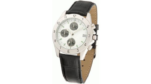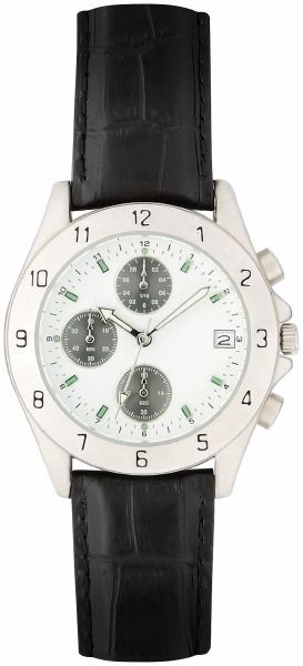 Airport. Japanese chronograph movement with date. Functions : 1/10 sec, second and minute. Case dimension : 39 mm. Dial print diameter : 26.9 mm. Metal case with brushed chrome finish. 3 ATM water resistant. Black croco pattern leather strap.