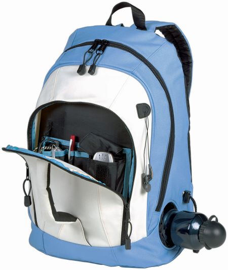 Rucksack With Handle. Rucksack with bottle compartment, zipper front pocket with several pockets to store your small accessories in, such as pens, CD's and MP3 players. With special opening for your earplugs and padded shoulder straps. 600D.