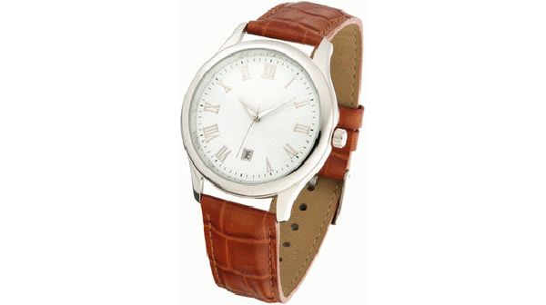 | Material : | Shiny chrome metal case. 20 mm light brown croco pattern leather strap. |