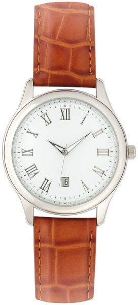 Madere. 3 Hand movement with date. Case dimension : 39 mm. Printing diameter : 31 mm. Shiny chrome metal case. 20 mm light brown croco pattern leather strap.