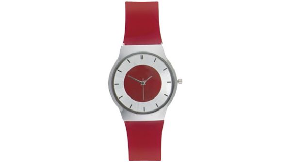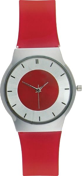 Bahia. Case dimension : 35 mm. Printing diameter : 17 mm. Any other colour of strap from 500 pcs. Slim metal case with shiny chrome finish. Red PVC strap.