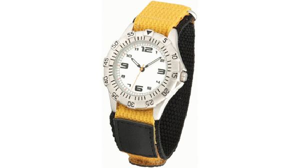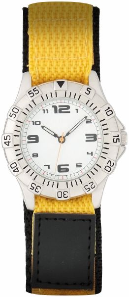 Athens Gents. Case dimension : 38 mm. Printing diameter : 24 mm. Calendar option. Metal case with brushed chrome finish and rotating bezel. 3 ATM water resistant. 18 mm orange velcro strap.
