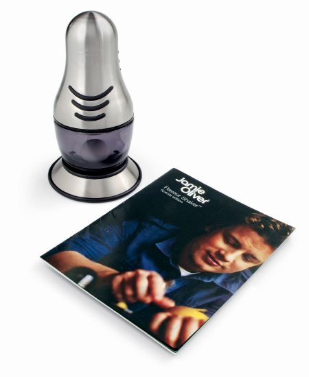 Special Edition Jamie Oliver Flavour Shaker. Special edition stainless steel Flavour Shaker mounted on a stainless steel base. Including recipe book. Easy to use, just get stuck in and give it a good shake! Pukka!.
