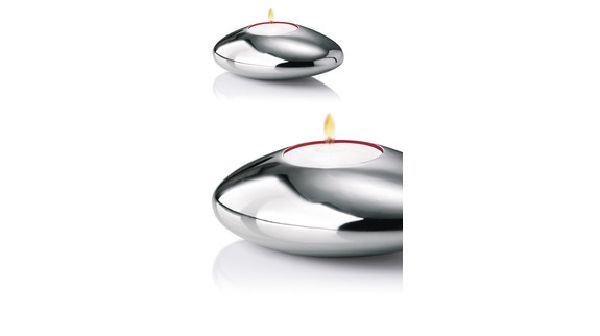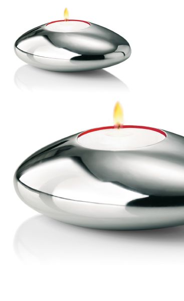 Lightstones. The design is inspired by the shape of the typical rocks found on Danish beaches. The rocks are ground into organic round shapes by the constant waves hitting the beach and the equally constant undertow dragging them back towards the sea. This shape is translated into two elegant candle holders. Stainless steel.
