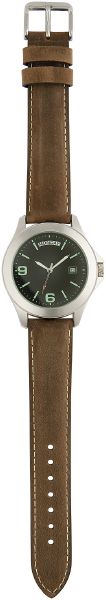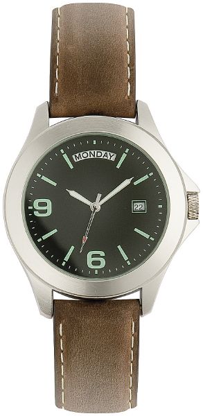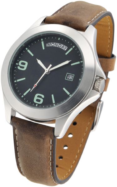 | Features : | Metal case with 20 mm leather strap. 3 ATM water resistant. 3 hand day and date japanese movement. Case dimension: Ø 42 mm. |