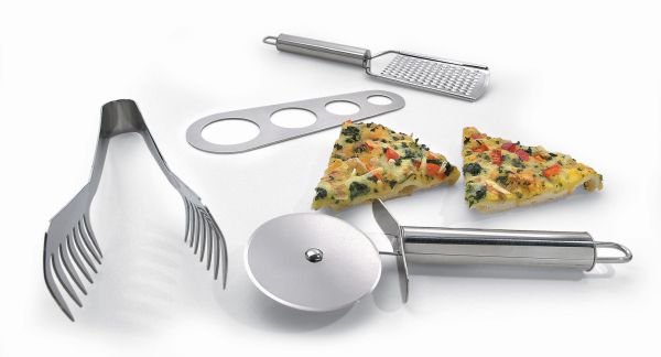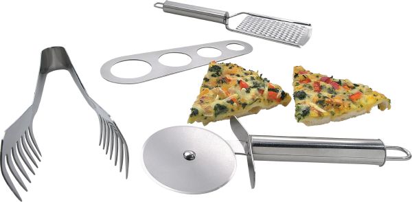 4 Pcs Pasta Gift Set. Cheese grater, pasta measurer, pasta fork and pizza cutter in a grey carton box.
