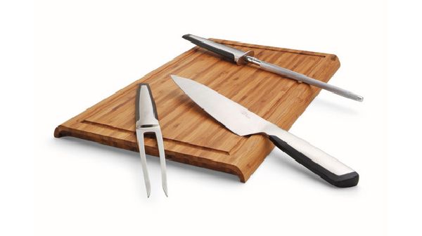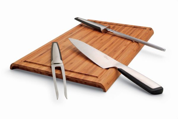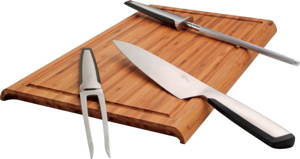 Knife Set & Cutting Board. This is a beautifully designed bamboo cutting board combined with 3 must haves for every cooking enthusiast. The knife will easily cut meat and vegetables, while the carving fork holds food steady. Sharpen the knife with the added sharpener. In gift box.