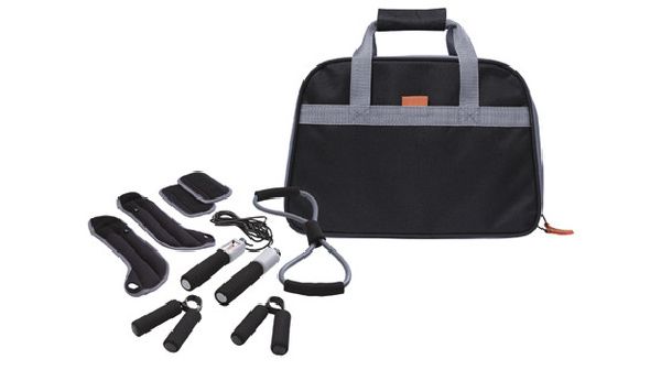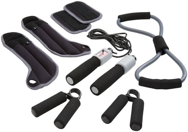 Stay Fit 9 Pcs Personal Fitness Kit. Nine piece set includes zippered case, one pair of hand grips, one pair of ankle weights, one pair of weights, exercise band and skipping rope. Front pocket. 600D polyester.