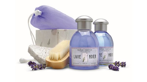 5 Pcs Lavender Bath Set. Bath gel, 170 ml shower gel, sponge, nail brush and scrub stone in gift box.