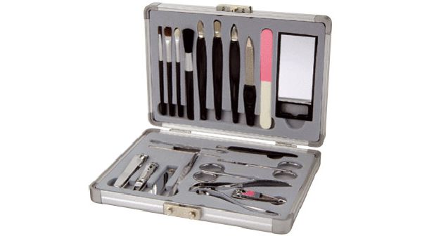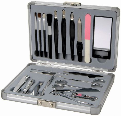 21 Pcs Manicure Set. Lip liner, eyebrow brush, shadow applicator, blusher brush, knife shape pusher, round pusher, tine pusher, nail file, nail polisher, mirror, cuticle trimmer, scissors, nail clipper, side nail clipper, round head scissors, tweezers, nail file, tiny nail clipper, big nail clipper, earpick, cuticle stick in a case. In aluminium box.