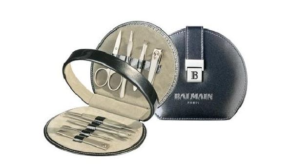 Balmain Roubaix 9 Pcs Manicure Set. Scissors, cuticle trimmer, tweezers,nail clippers, hand cuticle trimmer, blackhead remover, foot cuticle groomer, pusher, nail file in a luxury pouch.