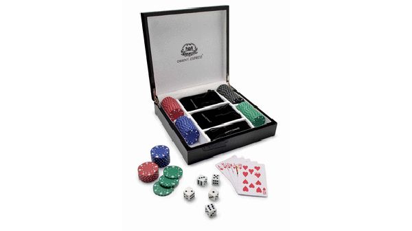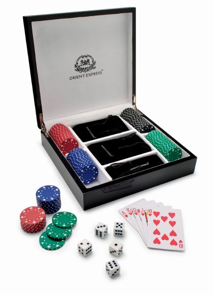 Hambourg Poker Game. 4 x 25 Chips, 2 decks of cards and 5 dices, all with velvet pouches in luxury piano lacquered wooden gift box.