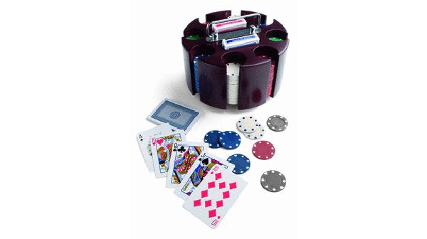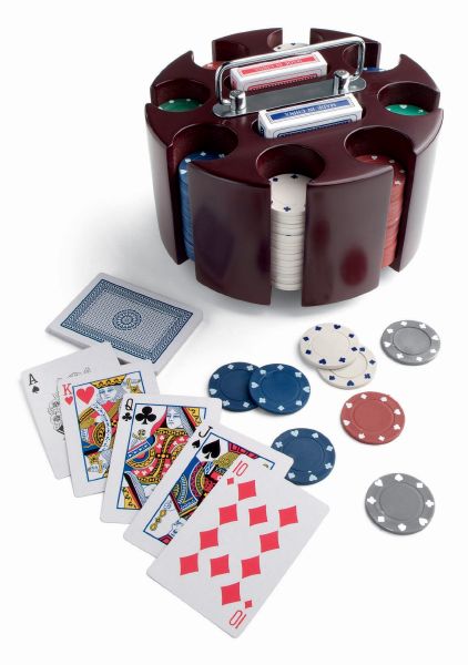 Poker Set. 4 x 50 Chips and 2 decks of cards in attractive rotating wooden stand.