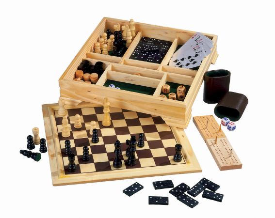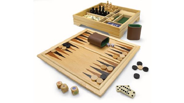 6 In 1 Game. Backgammon, chess, cribbage, dominos, cards and dices in quality oak box.