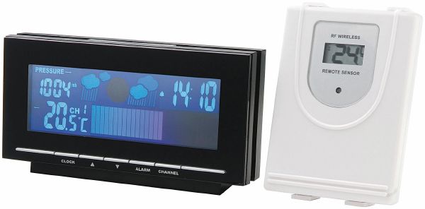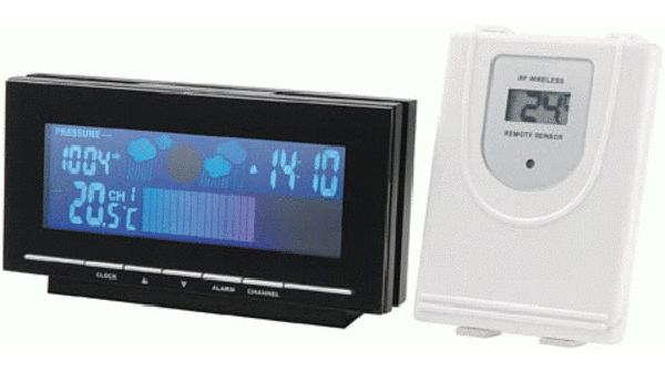 Wireless Thermo Clock. Highly accurate, wireless indoor and outdoor weather station via radio frequency. Features indoor and outdoor temperature C/F, time, barometer, weather forecast and alarm on a coloured screen.