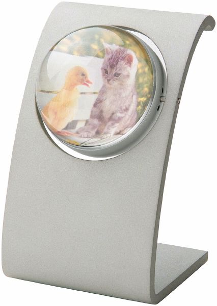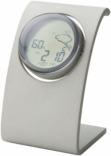Rotating Desk Weather Station. High quality rotating desk weather station featuring time 12h/24h, date, temperature C/F, humidity and animated weather forecasting icons. Reverse of rotating clock can be used as photo frame or to print your logo. Metal.