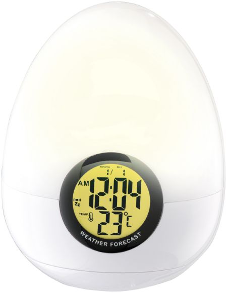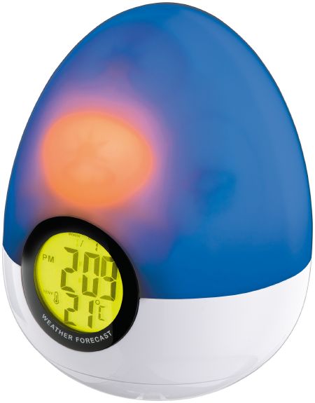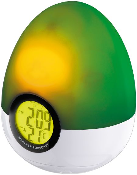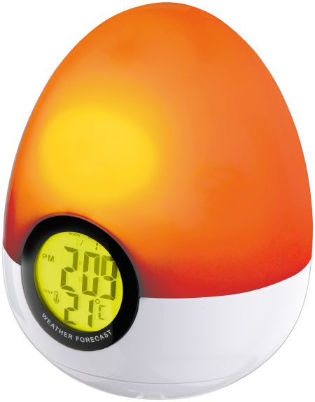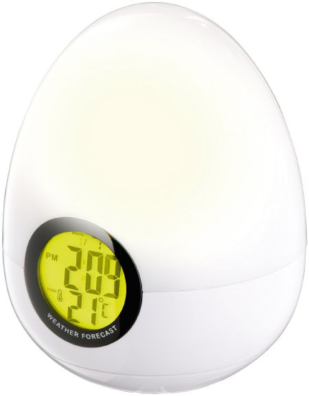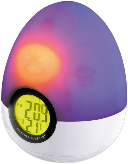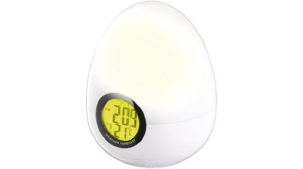 Egg Weather Station. Colour changing soothing light with 4 colour changing glowing icons. Simply touch to stop the alarm with snooze function, built in sensors, 24 hour or AM / PM setting, time and temperature display, rock to show glowing weather icons and rock to stop the alarm.