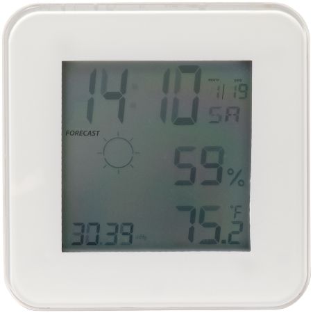 Multi-Function Weather Station. Weather forecast with barometer multi-function LCD clock. LCD screen displays 4 different weather situations and features an indoor thermometer, temperature displays C/F and indoor hygrometer function. Snooze alarm clock and low battery icon.